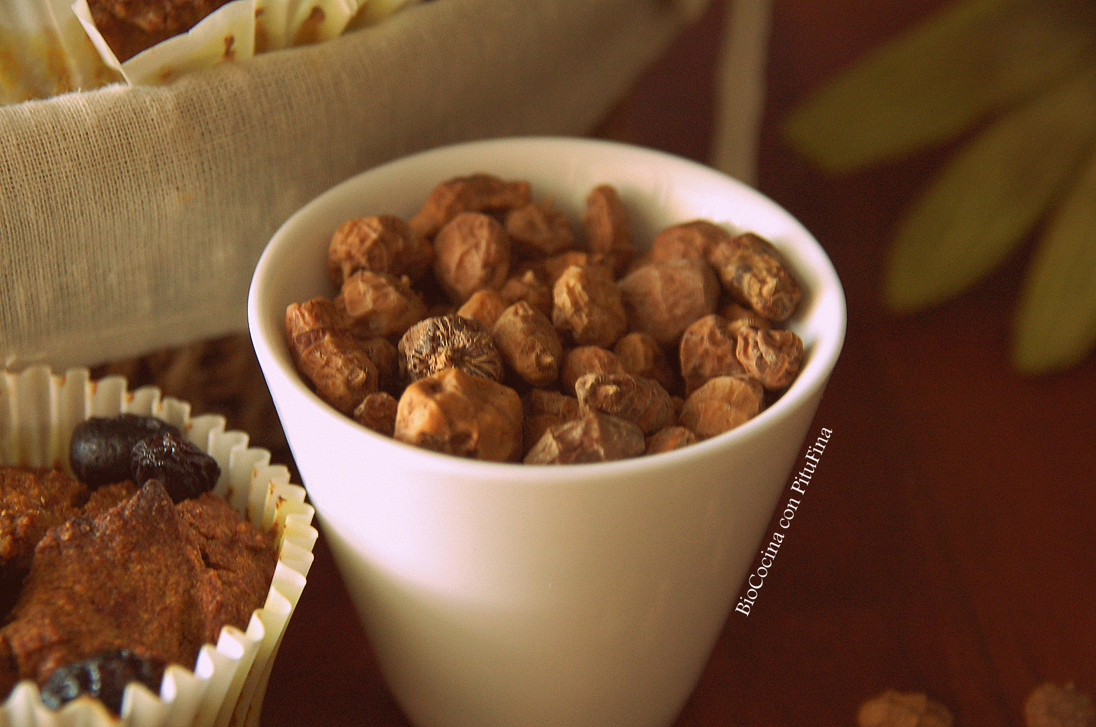 En la receta de Galletas de chufa y plátano, os hablé de este tubérculo, maravilloso… de forma aovada, con cicatrices anulares, carnoso, castaño por fuera y blanco por dentro y de sabor dulce. Entre sus propiedades destacamos, que son buenas para la digestión, ricas en omega 9, que ayuda a disminuir el colesterol, y ricas en vitamina E y C. Además son un alimento prebiótico, lo que quiere decir que son buenas para el intestino y aumentan las defensas.