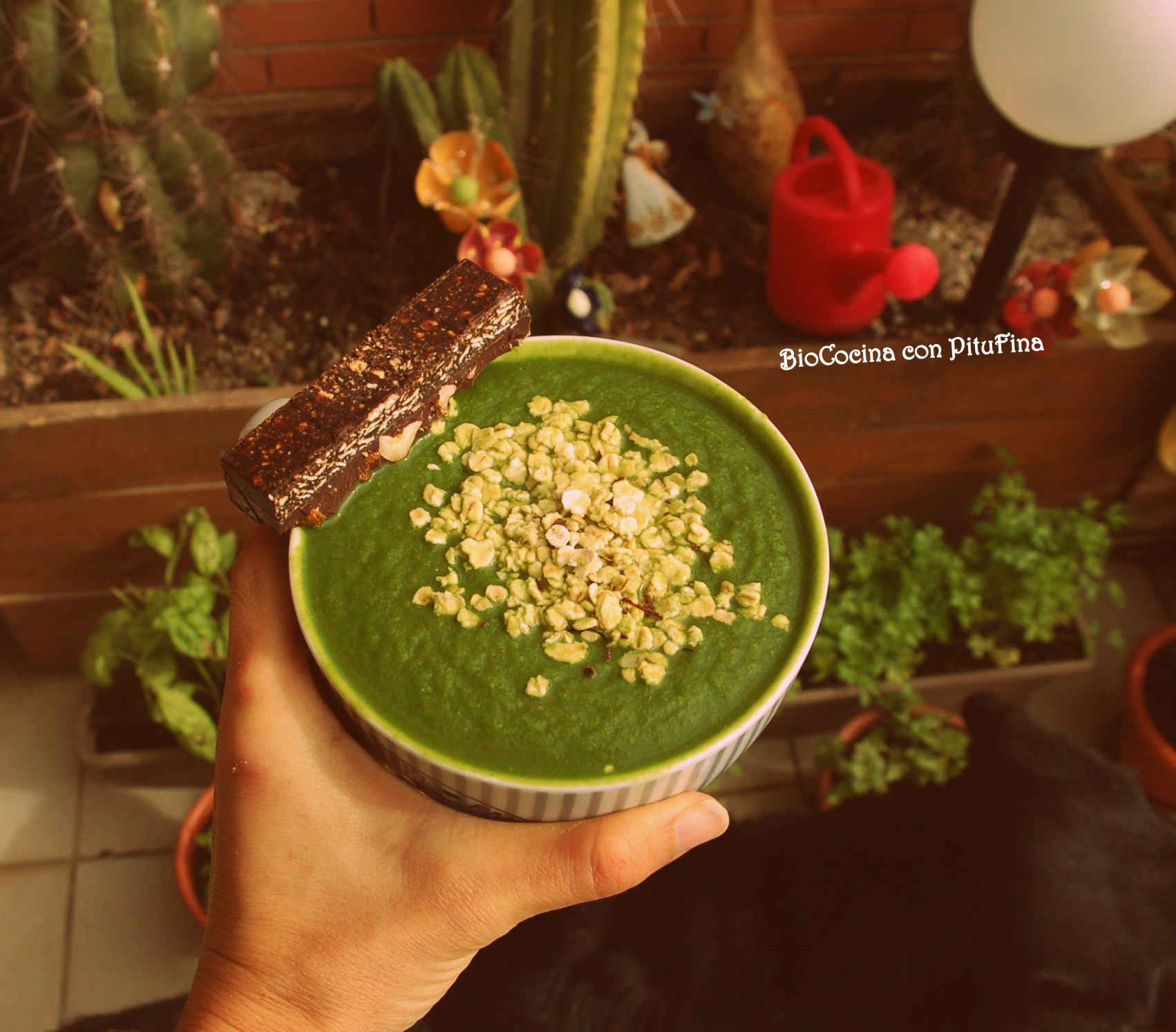 PD: jajaja, la que está debajo de mi batido, en la segunda foto, es mi perra, Kenia, maravillosa como siempre, que casi hace que me parta los dientes, tire mi batido súperpoderoso, eche a perder mi tableta de 2 chocolates, y aplaste masivamente mis nuevas plantas aromáticas… ahhhh… eso ha sido suerte, azar! de la buena! 😉